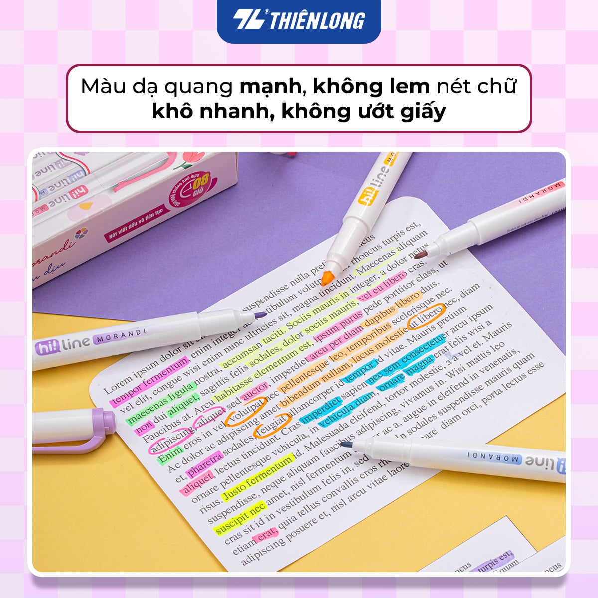 Bút dạ quang màu Morandi Hi! Line Thiên Long HL-024 – Công nghệ chống khô mực — nét đậm rõ ràng, thích hợp viết bảng và trang trí.