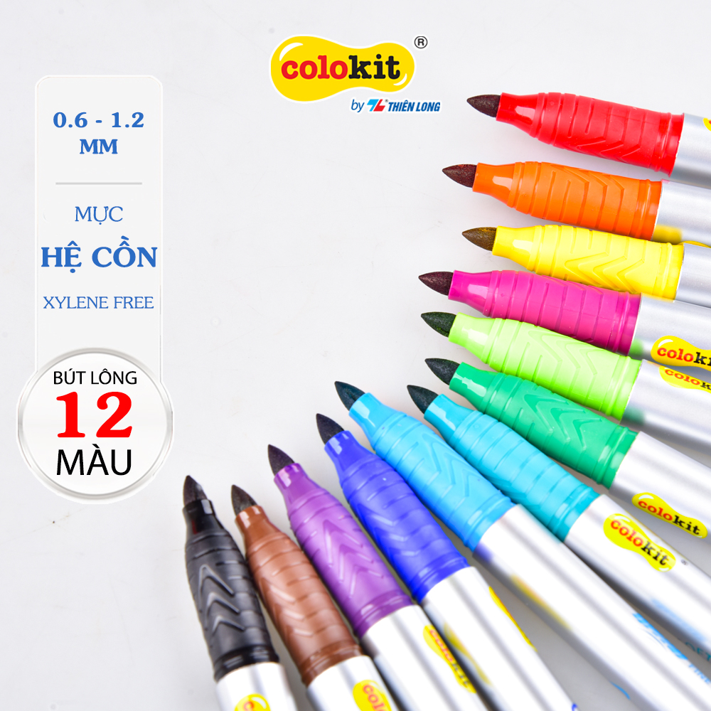 Hộp 12 bút lông dầu mỹ thuật Colokit PM-C01 vẽ được trên nhiều chất liệu, màu mực đậm, tươi sáng — ngòi lông bền, màu tươi sáng, phù hợp vẽ và viết.