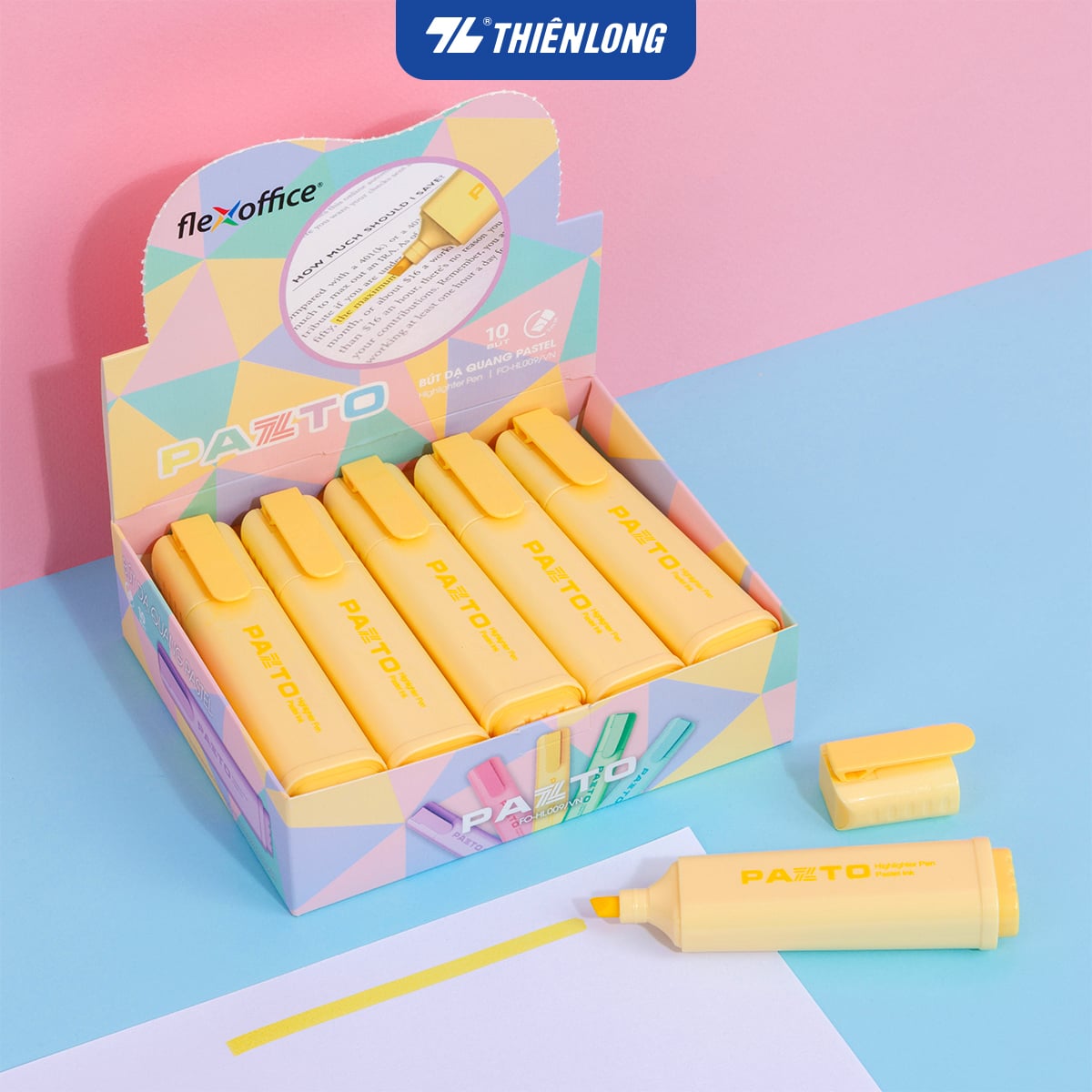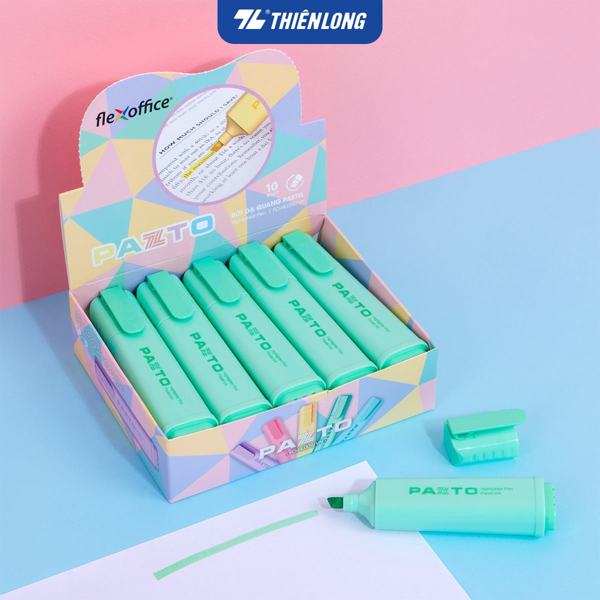 Combo 10 Bút dạ quang màu Pastel Thiên Long Flexoffice Pazto FO-HL009/VN – Bút dạ quang rửa được – Photocopy không làm mất nét chữ bên dưới — nét đậm rõ ràng, thích hợp viết bảng và trang trí.