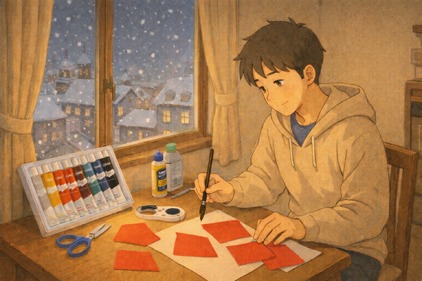 Tôi lấy ra tờ giấy A4 cứng màu đỏ, đặt lên bàn. Dưới ánh đèn vàng mờ, từng tuýp màu acrylic lấp lánh nhẹ. Tôi màu đen để đi những nét chữ thư pháp. Nét chữ đầu tiên run run, lạnh quá mà tay không vững. Nhưng rồi tôi lại cười, tự nhủ: “Ở đâu mà Tết chẳng cần chút đỏ để ấm lòng.”
